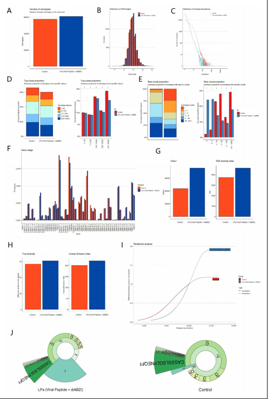 研究通过对TCR β CDR3库进行基础分析和克隆性评估,比较了对照组与LPs(病毒肽+diABZI)治疗组的克隆型多样性和分布特征。结果显示: